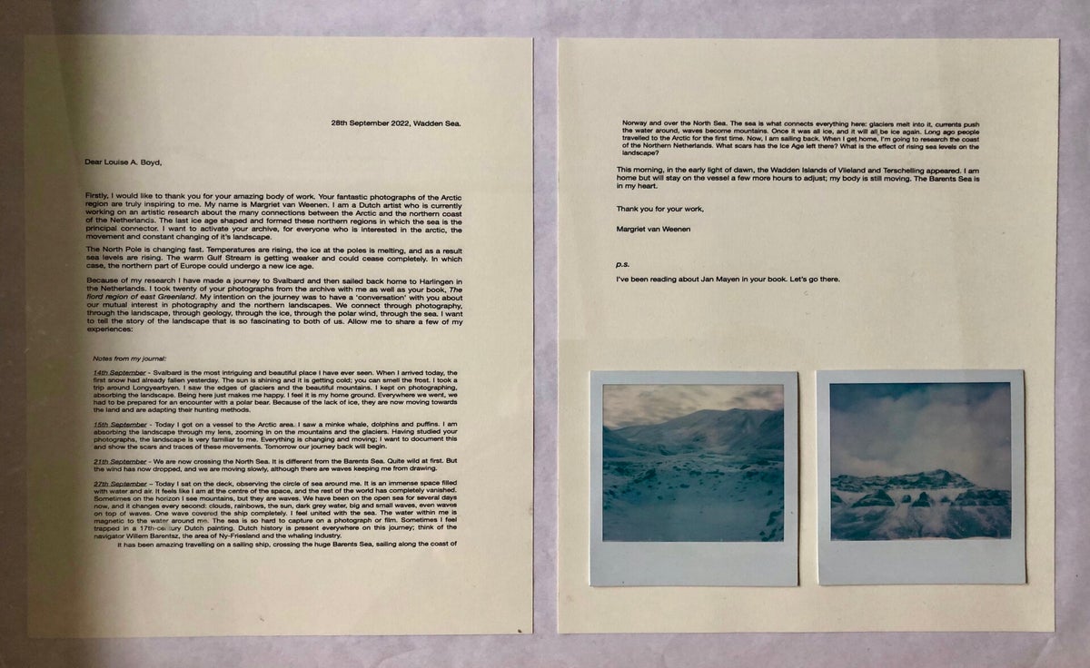 In deze tentoonstelling waren de eerste resultaten te zien. Er zijn twee gedeeltes. De installatie ICE AGE IS COMING bij Galerie Block C. Het archief: Sailing Home in conversation with Louise A. Boyd. Hiervoor heeft ARTisBOOK ruimte en presentatiemateriaal ter beschikking gesteld. Deze bevat een selectie van het materiaal dat ze verzameld en gemaakt heeft voor en tijdens de reis.