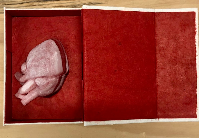 I melted Haribo cherries, and filled the heart halves with it. I also created 'pages' from the melted, cherries by pouring them into sheets and cutting them into the heart shape. The book was sewn together with a slipknot binding with transparent nylon thread and placed in a box for safe keeping.
