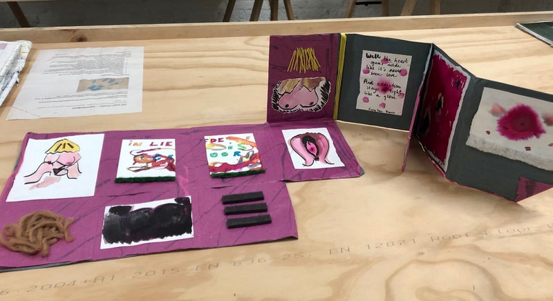 This book is about struggling to adapt to life in a new country. The idea of the book is that it gradually destroys itself since the pages stick together and every time it is opened the paint sticks to the opposite page. The pictures of people slowly become unrecognizible which symbolizes a fear of making long lasting relathionships while studying abroad.