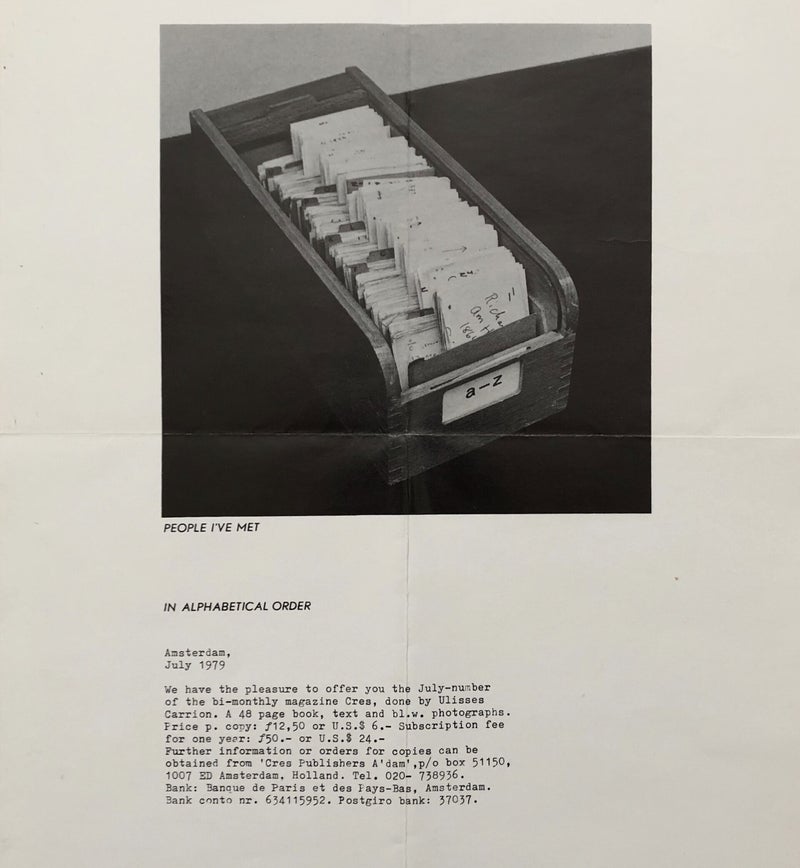 Ulises Carrión: "Ik denk, maar dat is interpretatie, dat ik steeds bezig ben met het probleem van de eigen identiteit. Het is merkwaardig dat veel van mijn boeken en andere werken, met "namen" te maken hebben. De naam is tenminste iets dat een persoon identificeert. Dat is iets heel onmiddellijks... Dat je een naam hebt, betekent dat je bestaat. Misschien voel ik at daar de sleutel van iets zit. Waarom zou ik mij zo bezig houden met namen". Hij heeft nog meer voorbeelden van werken waarin namen een rol spelen, zoals in Arguments (Bloknoot, no. 8, 1973) en Hamlet, for Two Voices (1977). Namen die bepaalde personen kunnen zijn, maar tegelijkertijd een model of een structuur aangeven, die naar ieders persoonlijke voorkeur is in te vullen. (bron: Lily van Ginneken, Volkskrant 21 juli 1979).